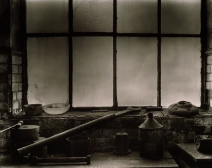 Ancienne cuisine rustique avec évier en pierre sous une fenêtre