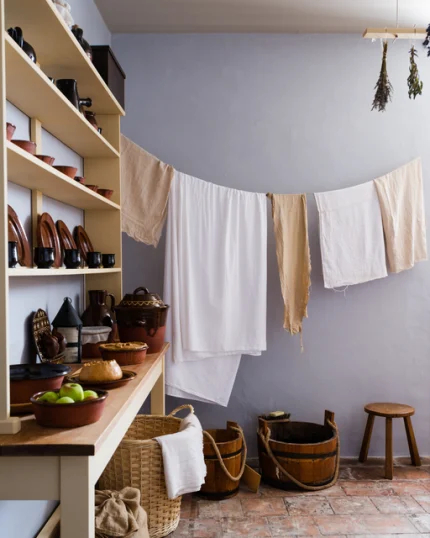 Bouanderie rustique avec étagères et linge étendu