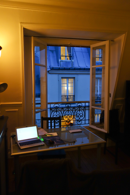 Bureau à domicile avec fenêtre ouverte sur cour parisienne