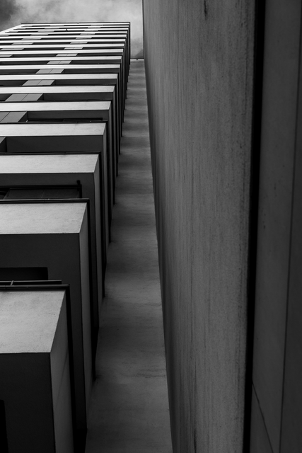 Perspective dramatique d’un immeuble moderne en noir et blanc