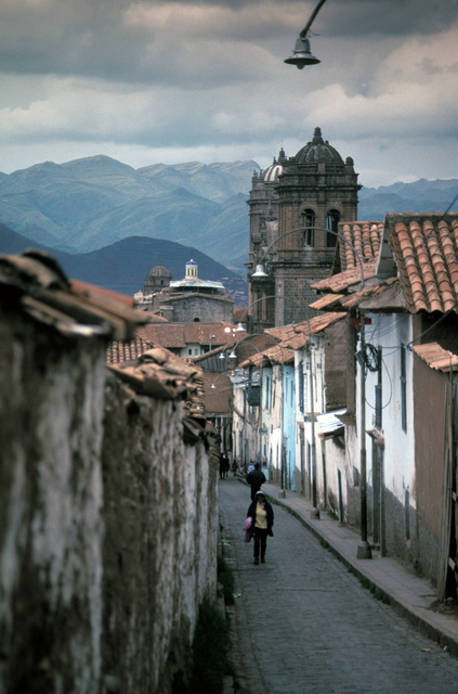 Rue étroite d’une ville coloniale avec montagnes en arrière-plan