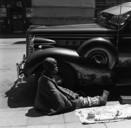Enfant assis sur un trottoir à côté d’une voiture ancienne