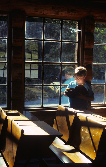 Enfant lisant dans une salle de classe en bois