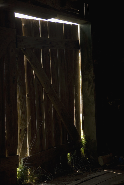 Porte de grange en bois illuminée par la lumière du jour.