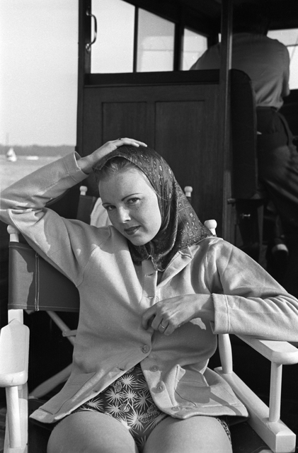 Femme en foulard et manteau assise dans une chaise pliante sur un bateau