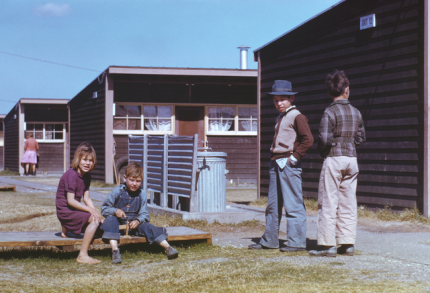 Enfants jouant devant des cabanes en bois