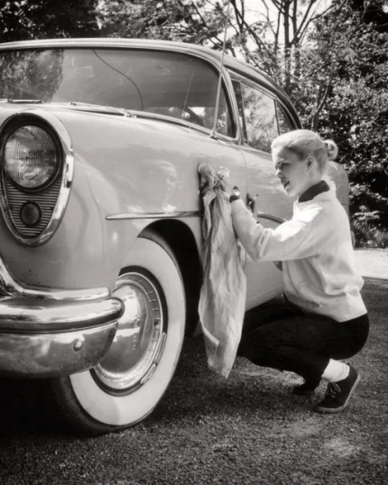 Femme nettoyant une voiture classique en extérieur