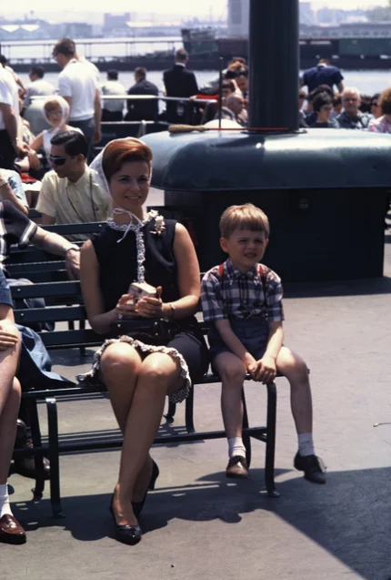 Femme et enfant assis sur un ferry en journée ensoleillée