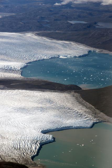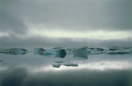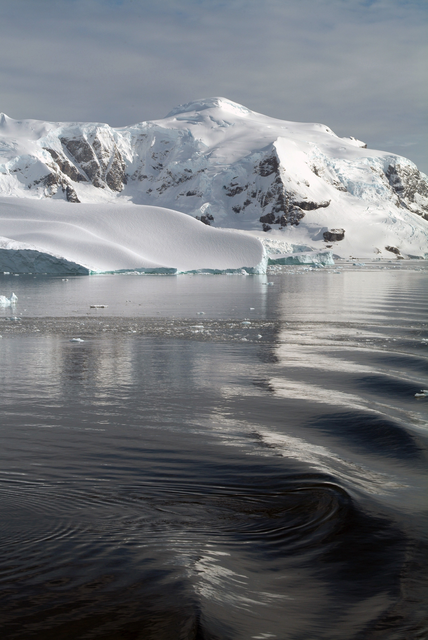 Iceberg flottant devant des montagnes sous un ciel orageux