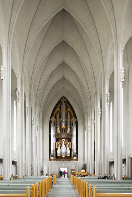 Intérieur d’une église moderne avec orgue et bancs