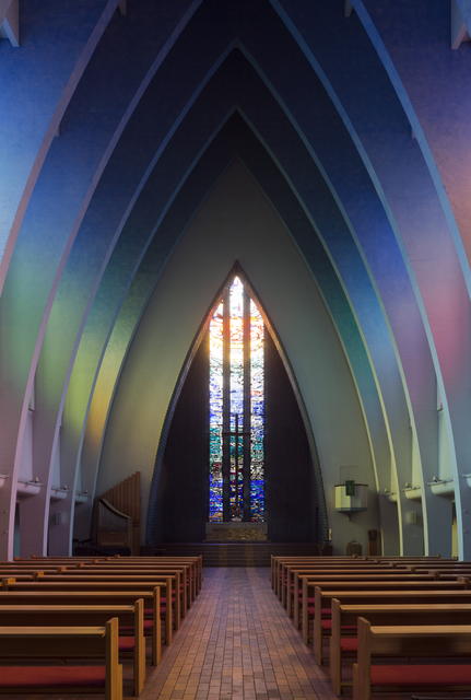Intérieur d’une Église Moderne avec Vitrail Coloré