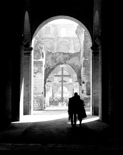 Couple marchant à travers une arche ancienne dans un site historique