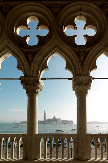 Vue à travers des arches d’un balcon sur la montagne et le temple