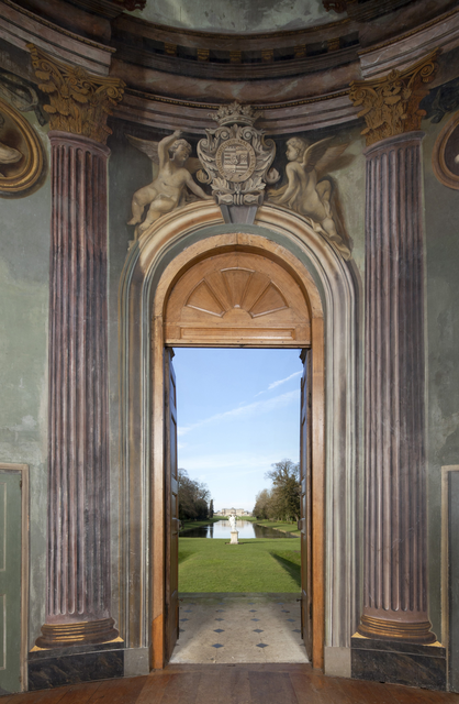 Vue à travers une porte ornée sur des jardins majestueux
