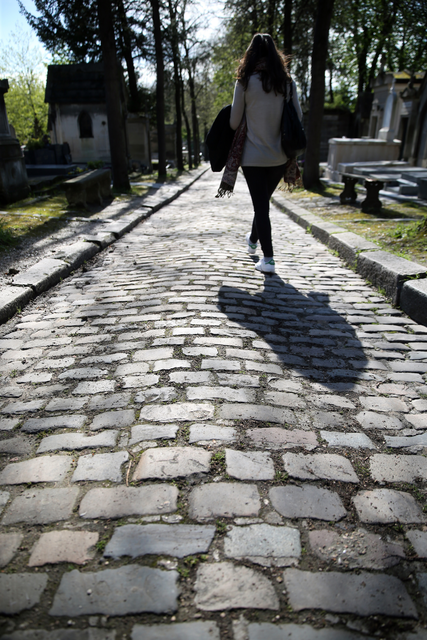 Femme marchant dans le cimetière ombragé