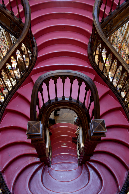 Escalier en bois et marche rouge dans une bibliothèque
