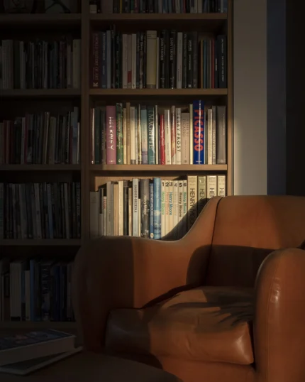 Coin lecture avec fauteuil en cuir et bibliothèque