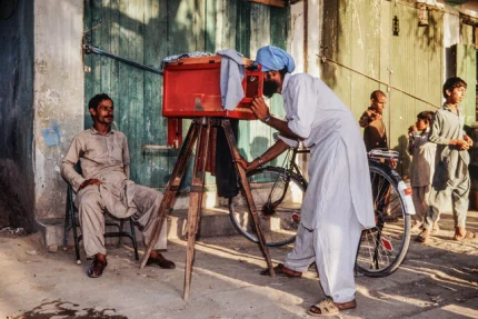 Photographe de rue avec une ancienne caméra en plein jour