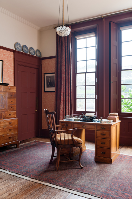 Bureau classique avec fenêtre vitrail et tapis rouge