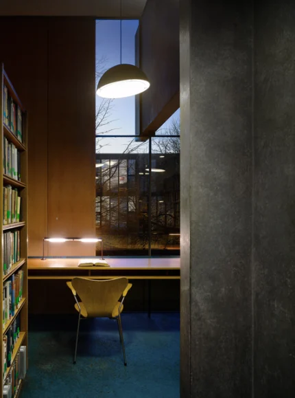 Bureau de lecture dans une bibliothèque moderne avec vue extérieure