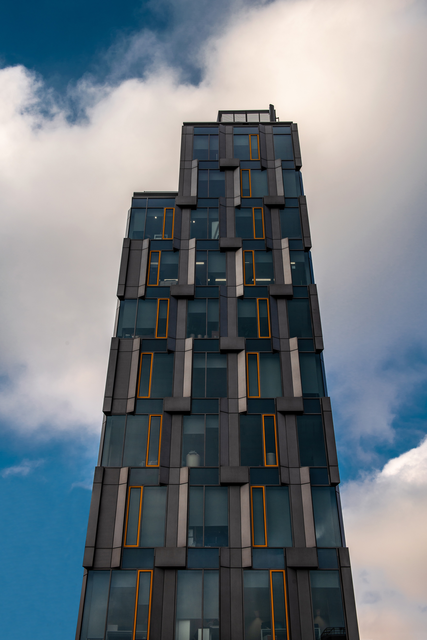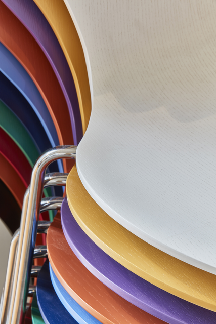 Chaise rouge dans une pièce lumineuse avec vue sur la ville