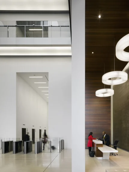 Hall d’entrée moderne avec réception et sculptures lumineuses