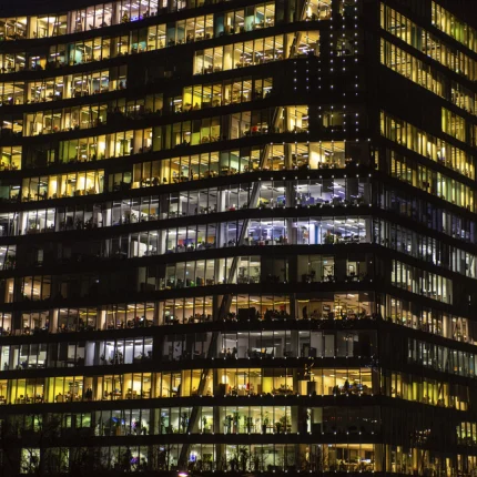 Immeuble de bureaux illuminé la nuit avec travailleurs visibles