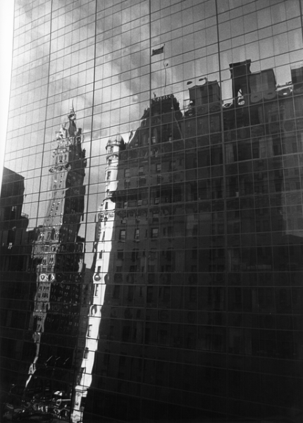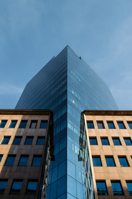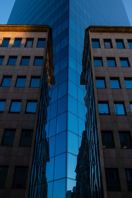 Immeuble en verre moderne avec reflets urbains