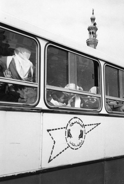 Mère et enfant regardant à travers la fenêtre d’un bus décoré