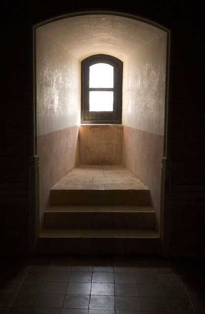 Fenêtre arquée illuminée depuis un passage intérieur