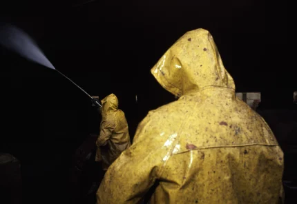 Travailleurs en combinaison jaune pulvérisant de l’eau