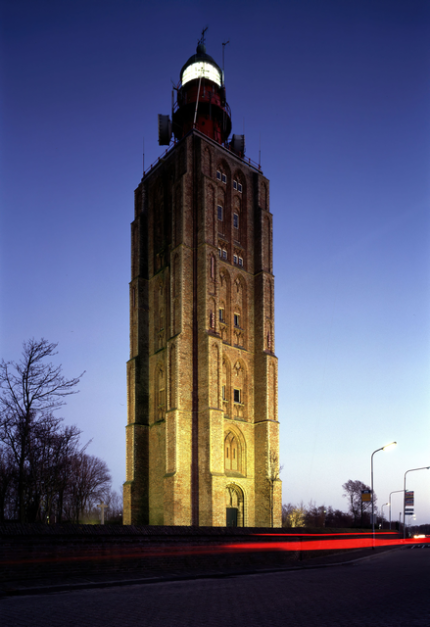 Tour en brique éclairée de nuit sous ciel clair
