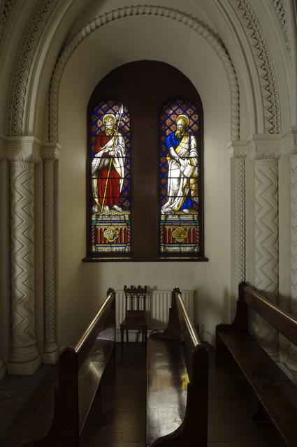 Vitrail d’église avec bancs en bois