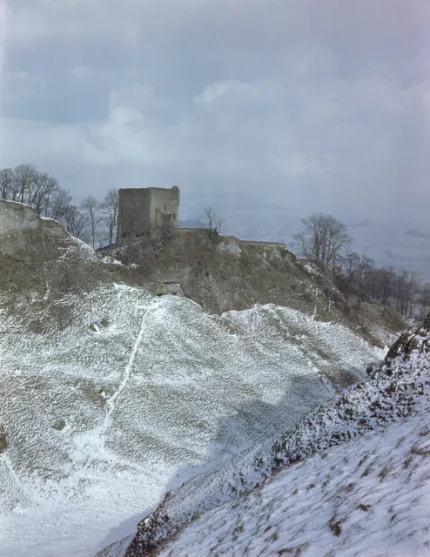 Ruines d’un château sur colline enneigée