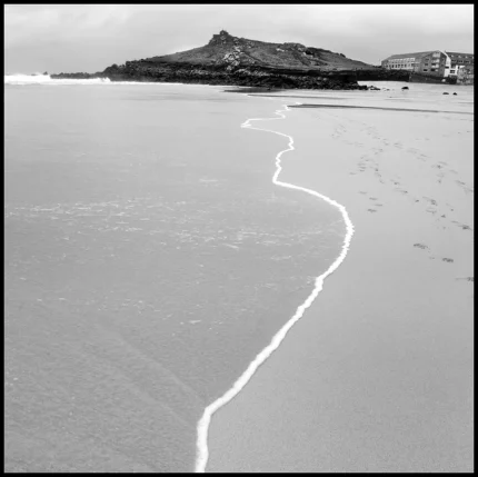 Ligne de marée sur une plage avec maisons en arrière-plan