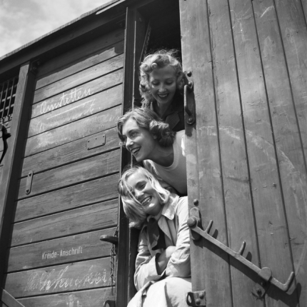 Trois femmes souriantes à la porte d’un wagon en bois
