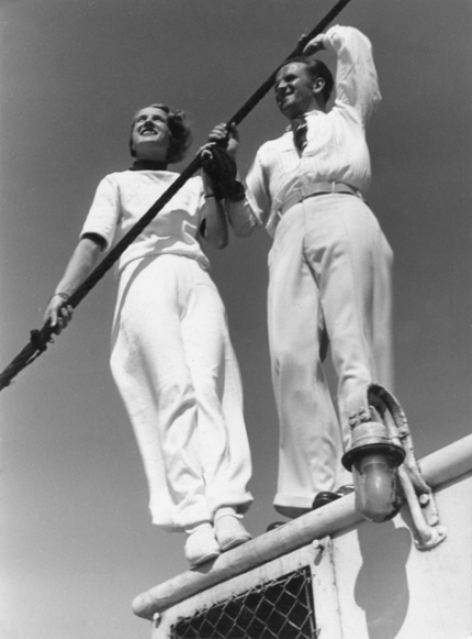 Deux adultes en tenue blanche à bord d’un bateau