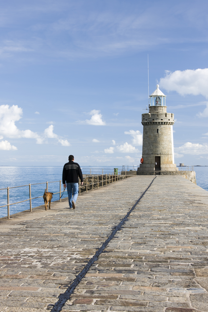Personne marchant avec un chien près du phare en bord de mer