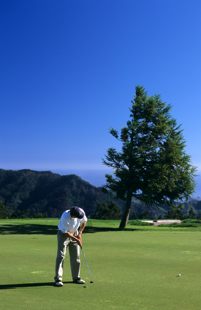 Golfeur se préparant à un putt sur un terrain de golf en montagne