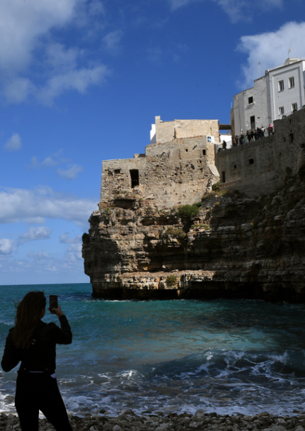 Femme photographiant une forteresse en bord de mer