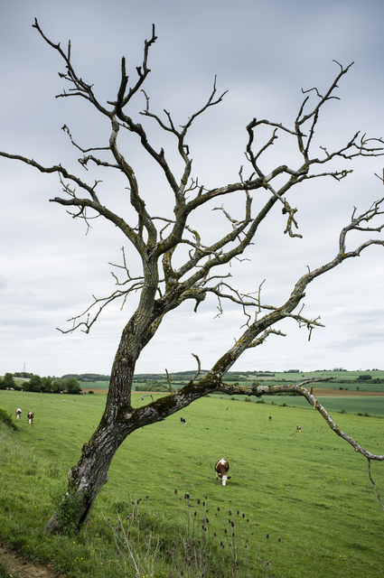 Arbre solitaire sous un ciel crépusculaire avec croissant de lune