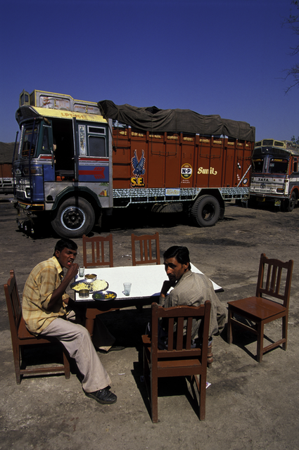 Repas en plein air devant des camions colorés