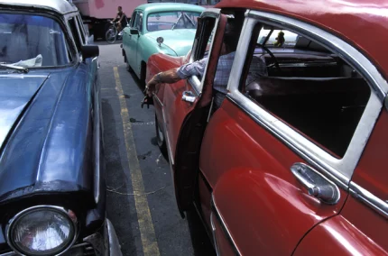 Voitures classiques en stationnement avec un homme tenant les clés