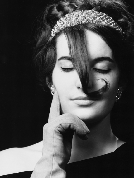 Portrait en noir et blanc d’une femme avec un bandeau scintillant