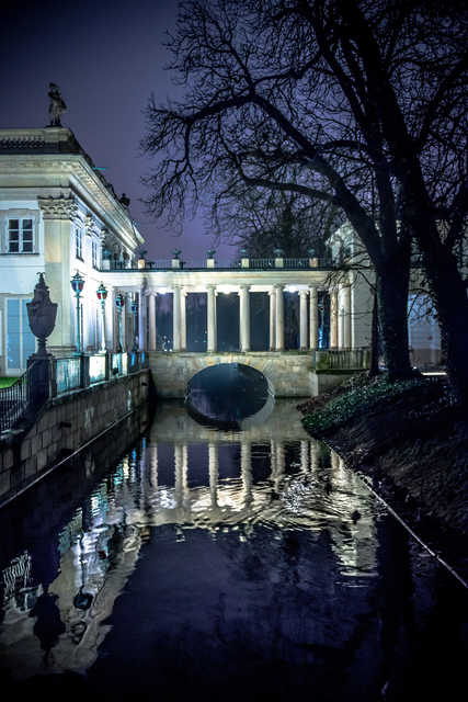 Palais avec pont sur canal la nuit