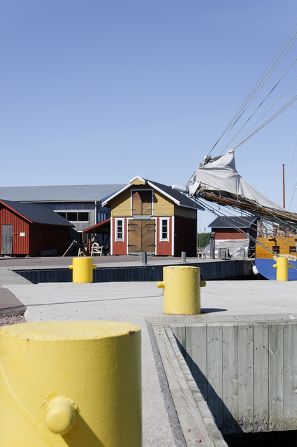 Port avec quais, maisons colorées et voilier