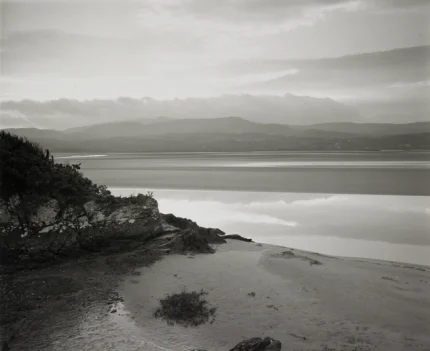 Maison sur une falaise au bord de mer avec vagues déferlantes en noir et blanc