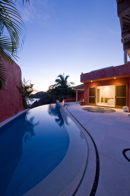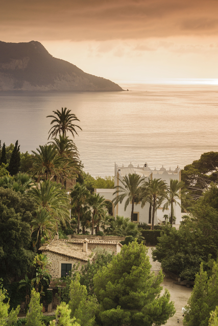 Vue sur la Méditerranée avec architecture et palmiers au coucher du soleil