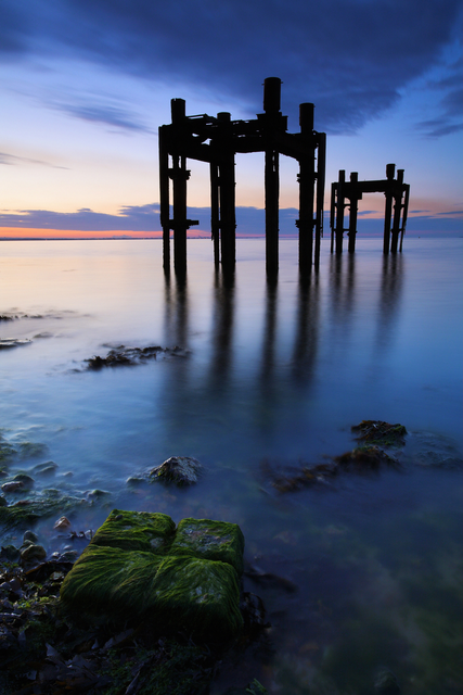 Silhouette d’un homme pensive au bord d’un lac au coucher du soleil