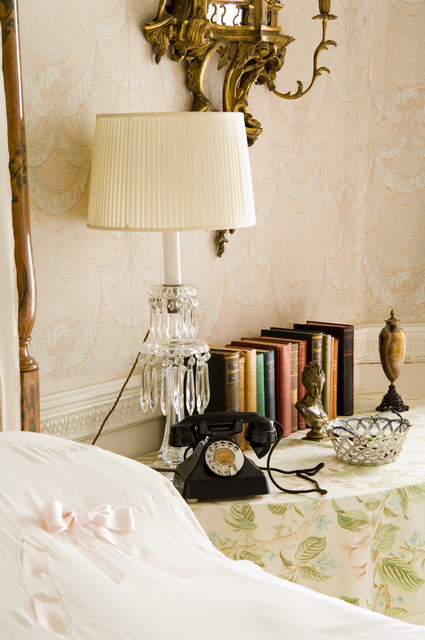 Table de chevet vintage avec lampe, téléphone rétro et livres